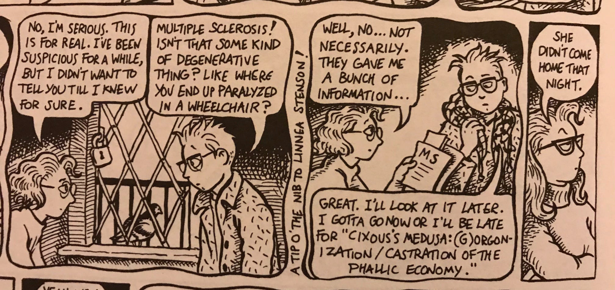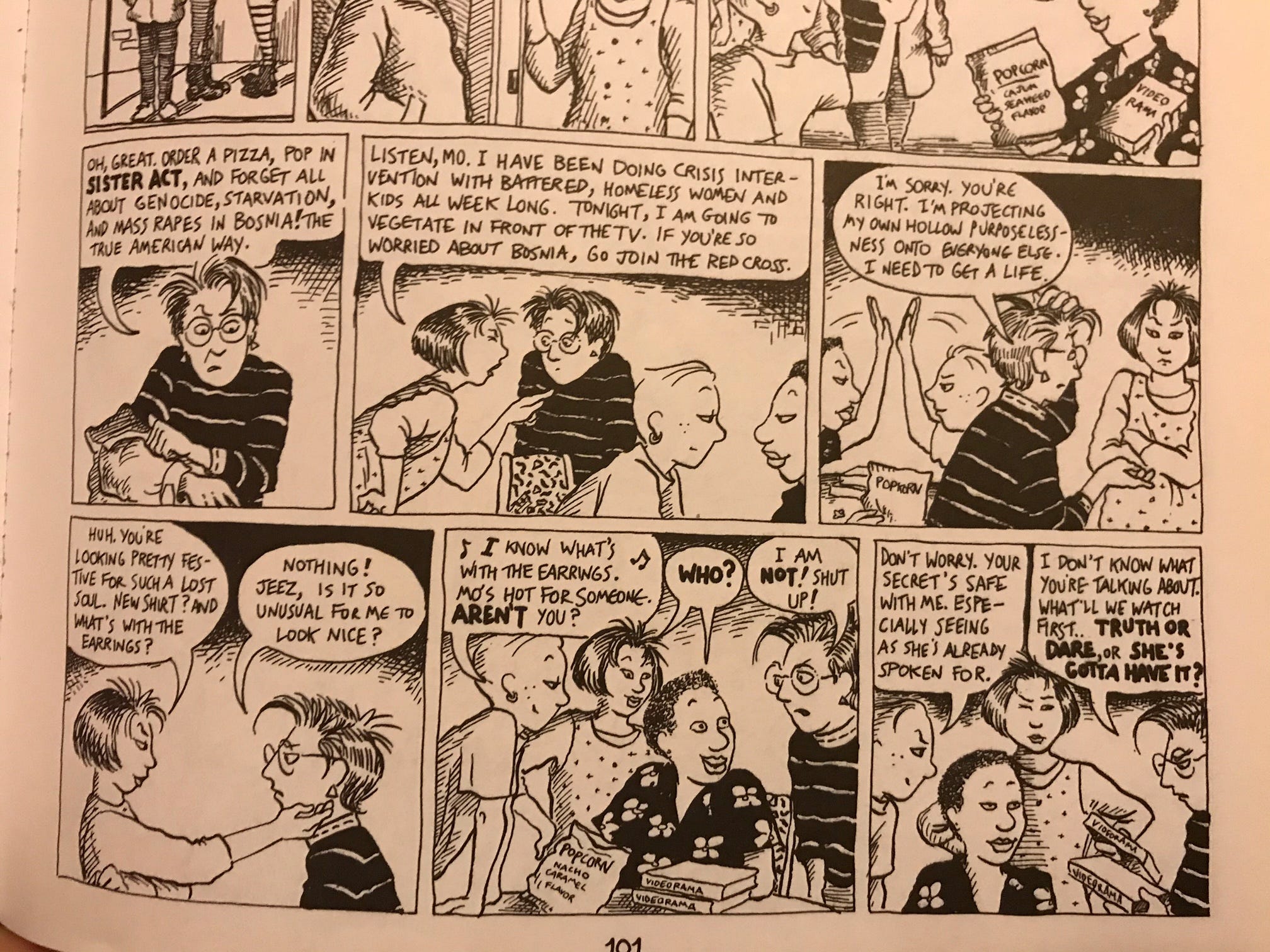 For the record, I don’t think Sydney is evil-- she’s just a lot less concerned than Mo is with appearing good, while they inhabit more or less the exact same social and class position within white America circa 1992-2007. Mo was never a revolutionary, with or without Sydney. Sydney seduces Mo into having a good time--and while they end up not exactly happily ever after, they are alive, and not killing each other, and having good sex. Imperial dream? Bad? Evil? My brain whirrs; my moral compass jerks. But the question of whether Sydney is good— or anyone is good— is beside the point of Dykes To Watch Out For. The point is that she, like the other dykes, exists. It’s a representation game. There are nice dykes, there are business dykes, there are punk dykes, poet dykes, Black lawyer dykes, Puerto Rican accountant dykes, and there are insufferable, superior, unbearably hot academic dykes. Really, Dykes To Watch Out For is merely a catalog of types of guys, where guy means queer person in or around Buffalo or Minneapolis. After many years of seeing novels and movies that are very bad be marketed on the basis of them containing a Type Of Guy, I have beef with representation as an end unto itself, but Sydney’s potential existence—all of their existence— motivated me, as I’m sure it did countless other queer kids, to perceive a future where we were just living our lives, even when we were pretty suicidal. What if someday you met someone hot who was lovingly obsessed with you and also made you furious, and you lived a life in which you and your friends had parties and dinners and fought sometimes but nobody was being abused, or was homeless, or undergoing a psychotic break? That would feel good.