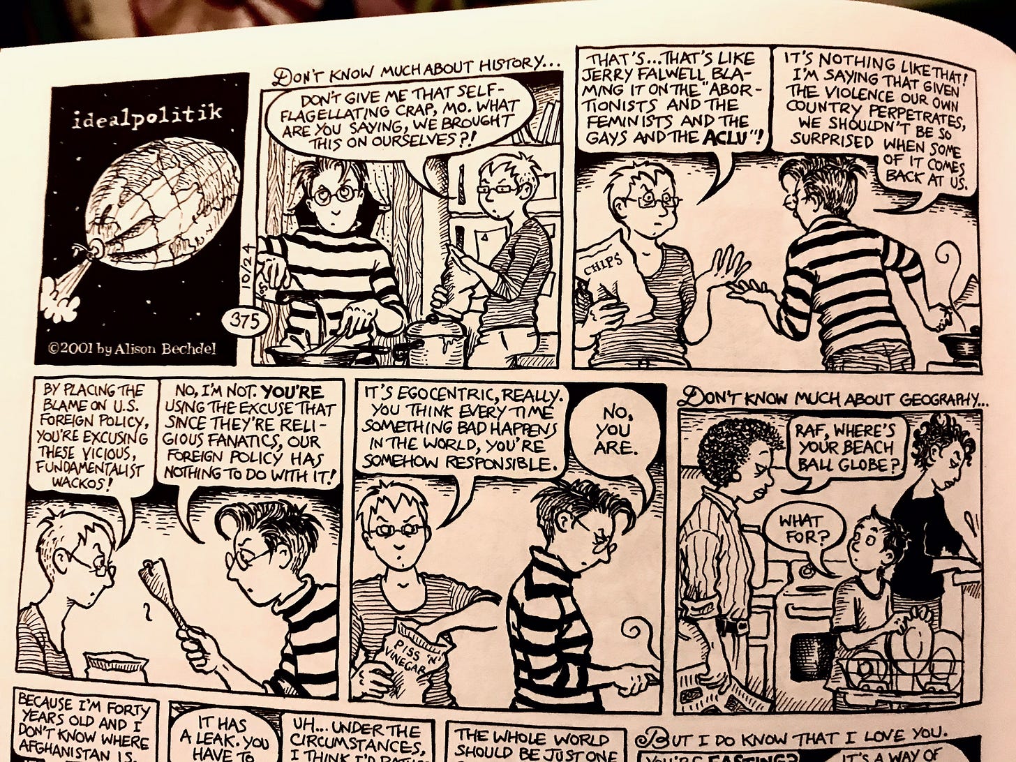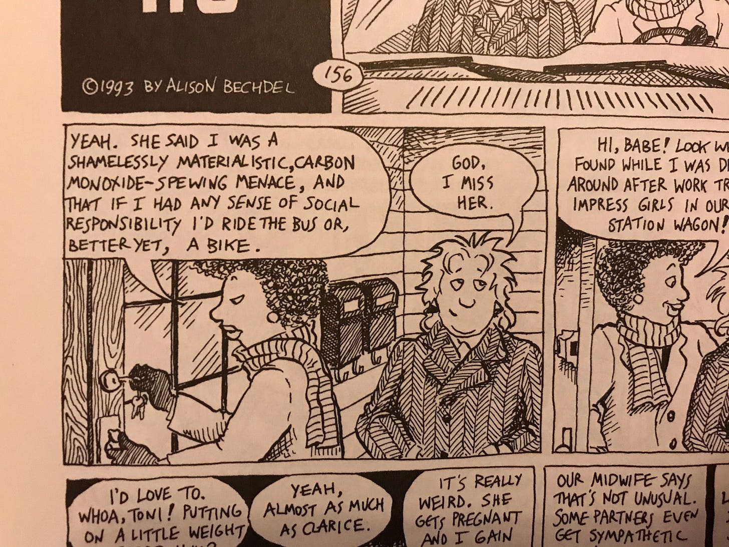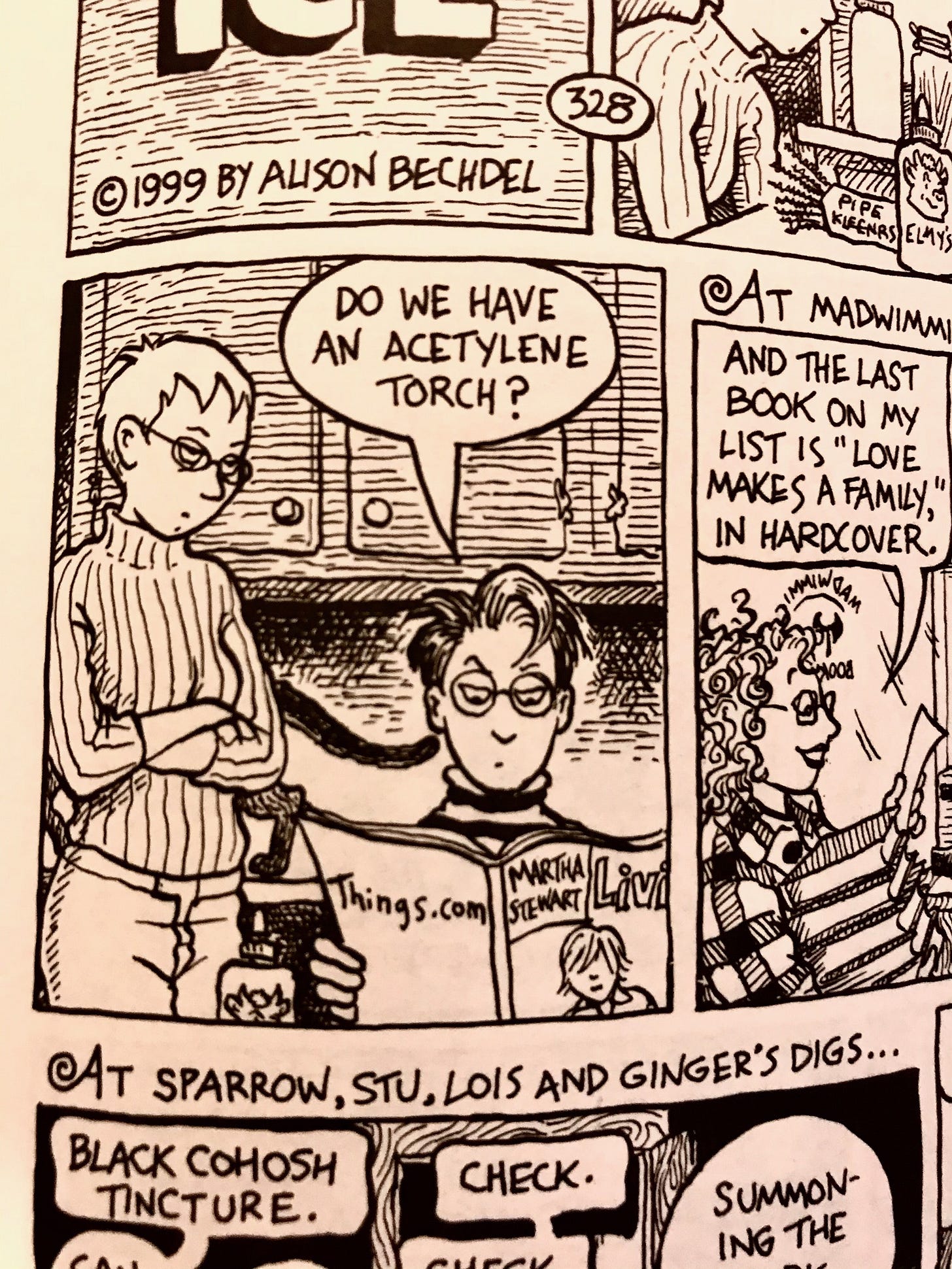 I recognize that my ability to picture myself in DTWOF has to do with this ability to imagine myself in a gradual comfortable-uncomfortable assimilation to American white middle-class norms on the order that Bechdel envisions. Other people I know find this comic alienating for its near-exclusion of weirdo leatherdykes, drug users, political zealots who can’t let their causes go, trans women (except the odd token), or people who experience harm even within chosen queer family and communities.