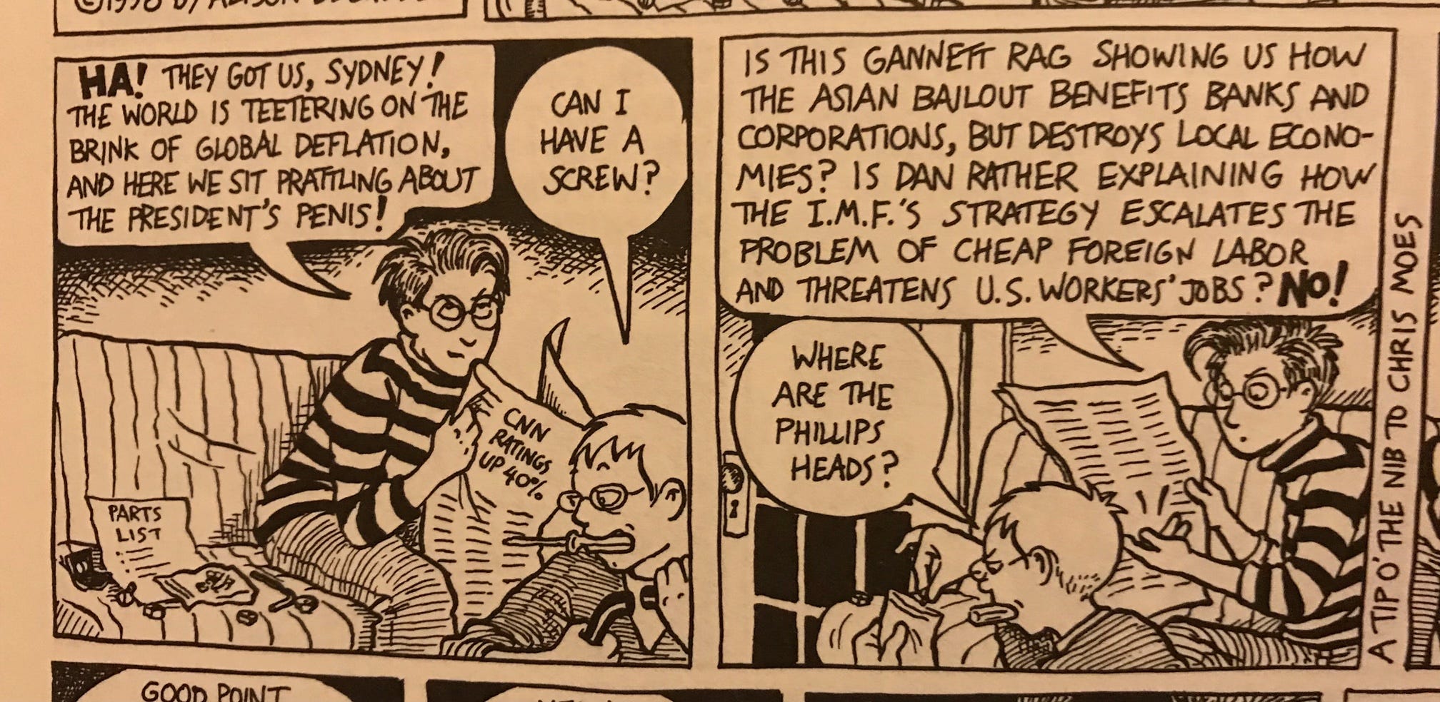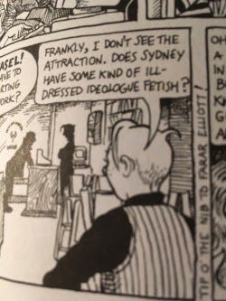 Saying “it’s enough that they’re ordinary people, they kept me alive” is to sidestep something. Like Harold Hill, Sydney is a free-wheeling self-interested actor, prone to philandering and domineering. She’s kind of a bully. She’s part of oppressive academic institutions that pressure her and others not to oppose the Iraq War (which she goes along with). She is passionate about buying things from online catalogs, sells her sext logs to “Panthouse” magazine, and we get many hints that she carries on an affair with her old flame Madeleine without regard for Mo’s feelings. Mo, in her turn, is pathetic, self-interested, passive-aggressive, and facile. But Sydney’s seduction of Mo and subsequent commitment brings Mo balance, at least within the fictional world of the comic, where we all get tenure and everything turns out okay. Does Sydney bring Mo into a darker, more ambiguous world, where she is less in touch with her own black-and-white sense of right and wrong? Unclear; it does appear that Alison Bechdel’s own politics have gotten considerably fuzzier on praxis post-2008, if her comics in 2016 are anything to go by. But Sydney’s seduction-- being drawn into argument with your queer lover who later 1999 email-sexts you that she wants to fuck you in a tableau involving office supplies-- is the sexiest slippery slope I can think of. I may be saying this because I too know and love a Sydney.