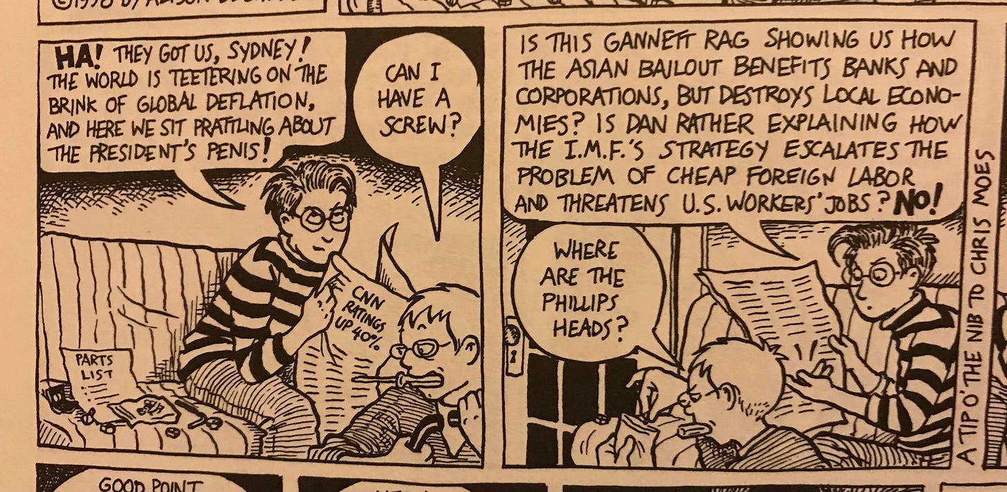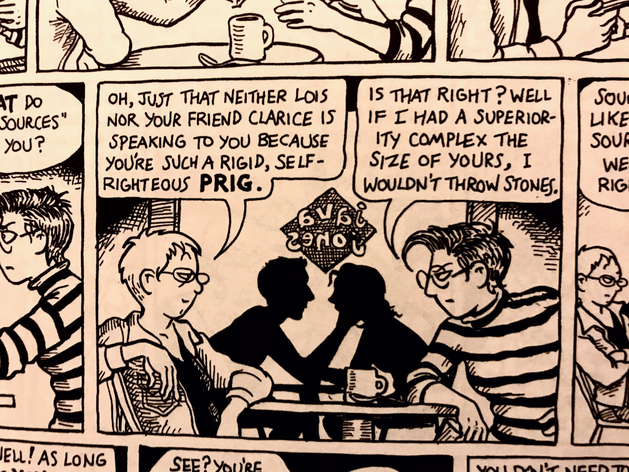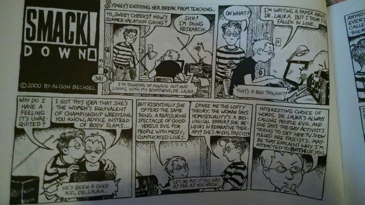 I learned about the March On Washington from documentaries after I read about it from Bechdel; I actually learned about the details of Clinton’s impeachment from reading Mo and Thea’s sarcastic takes on it. Sex wars, bi inclusion, the crisis of American independent bookstores, Michfest? Long before I read my first post calling out Kathleen Hanna for being trans exclusionary, I knew that there had been some kind of argument about land in Michigan; I discovered what kinds of people might believe different things about bombs in Serbia and dental dams. Up until ninth grade, my galaxy brain value systems had been informed by Christopher Isherwood’s politics circa 1930 and weird trans monarchist cartoonists on Livejournal; I was glad to see so many value systems ready-made to try out. I had arguments with other teenagers about whether Bechdel was transphobic, because her self-insert said bad things to trans women (for the record, Bechdel drew a couple one-off strips about how transphobia is wrong as early as the early 90s after conversations with Leslie Feinberg, and several of her characters go to Camp Ten Trees, though she also attended Michfest). There is a general bent of DTWOF’s characters being a little on the prudish side of things--Lois is the only sex freak, and even she ends up married with kids.