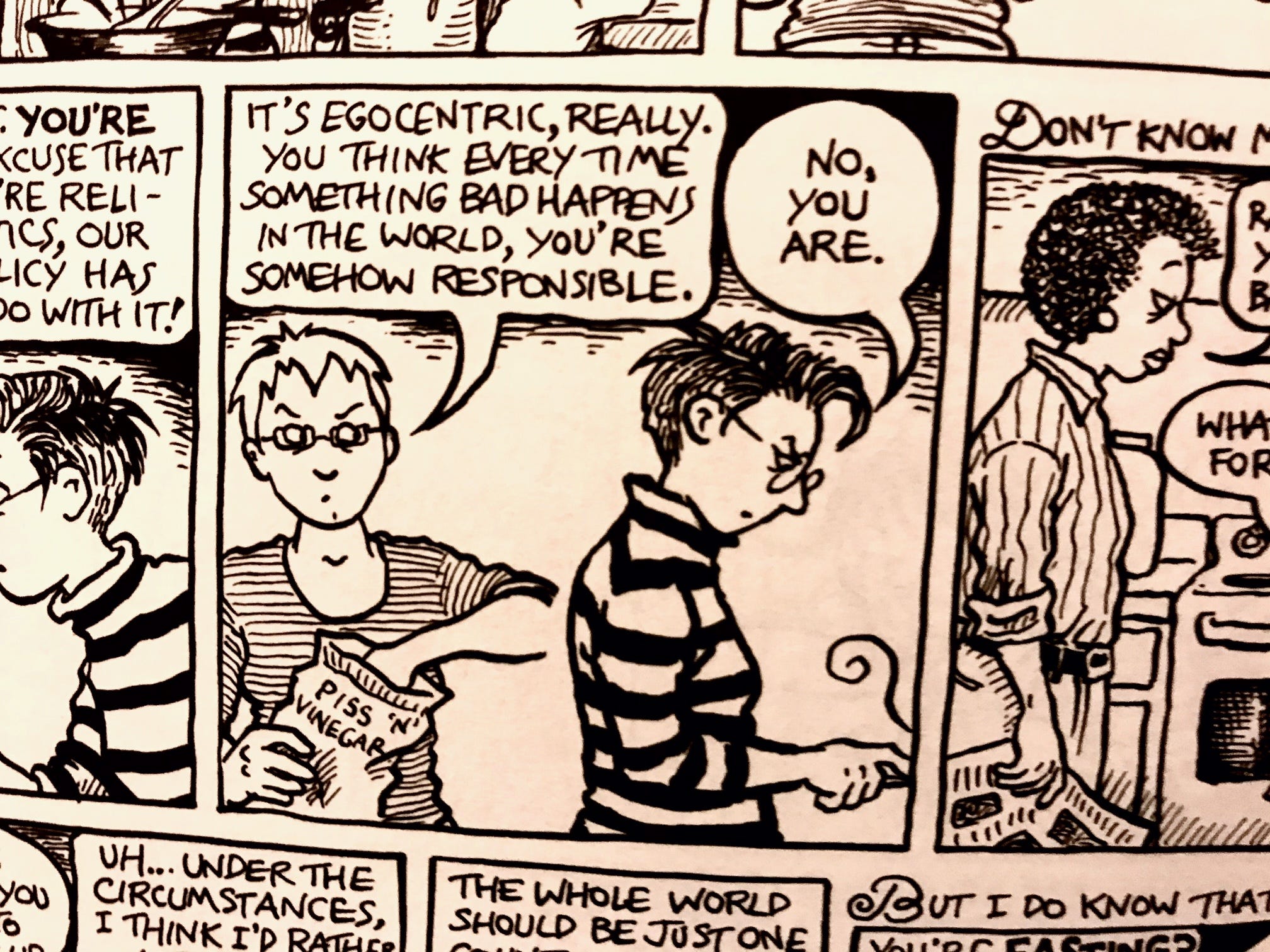 My friend Seph recently pointed out that it’s sometimes uncomfortable that Mo’s political feeling is so often the punchline of the joke in DTWOF-- while she occasionally lectures people about eating processed sugar, many of the issues she cares about concern violence against people that is ongoing, and the tone of the comic sometimes implies that to get this worked up at all about harm and violence is a comical personal flaw. But there are reasons for this other than moral righteousness--Mo boycotts friendships because people move to the suburbs, gets petulant when her crush doesn’t like her back, lectures Lois on having too much sex, and in general is kind of a pill. Politics, justice, is just an excuse.